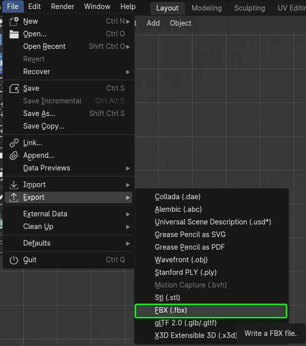 2. Select **\[File] - \[Export] - \[FBX]**
