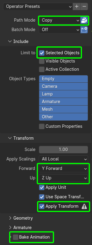 3. Check the following FBX Export options.
